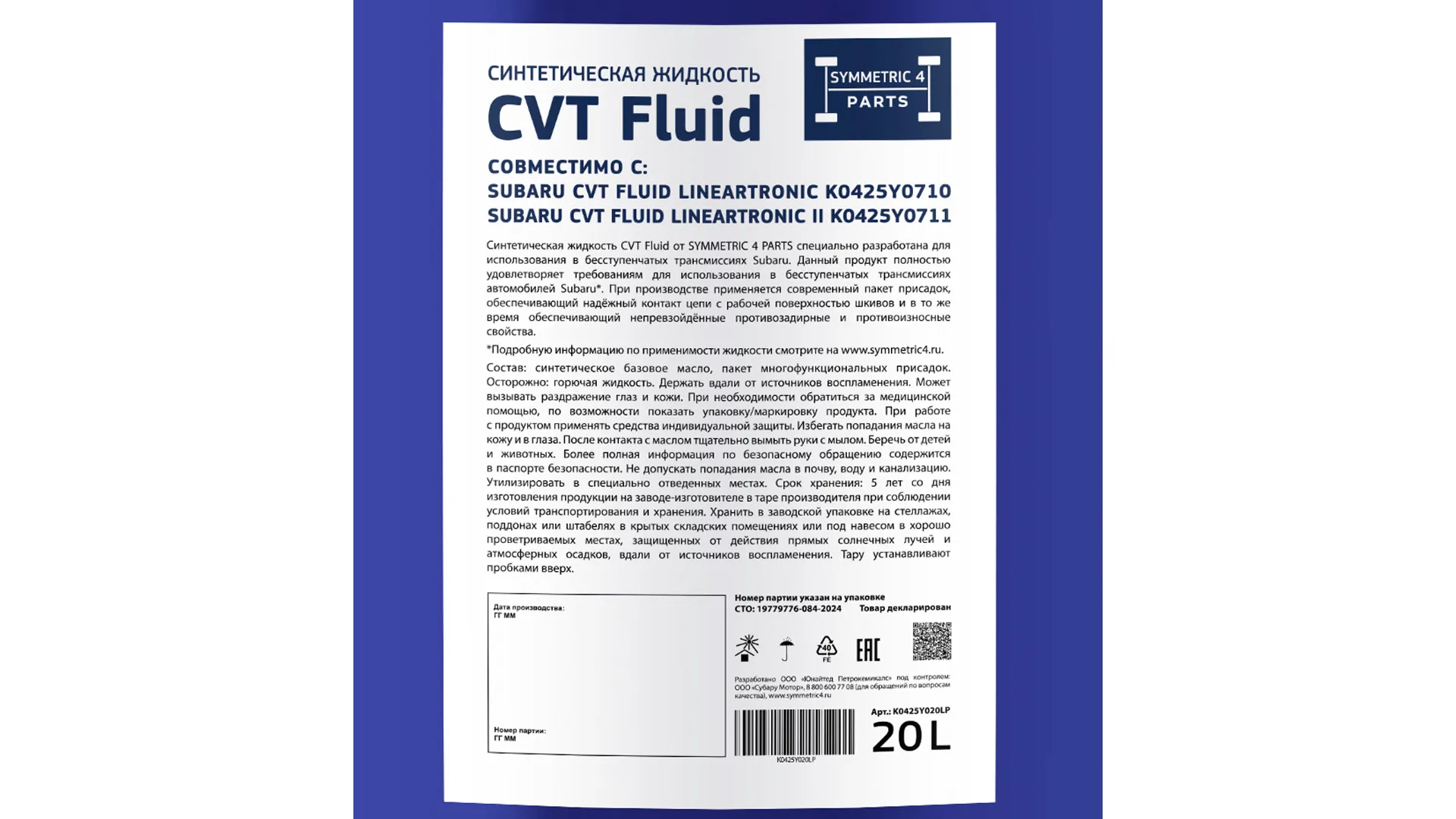 Синтетическая жидкость Symmetric 4 Parts для использования в CVT автомобилей Subaru. Поставляется в 20 литровых вёдрах.