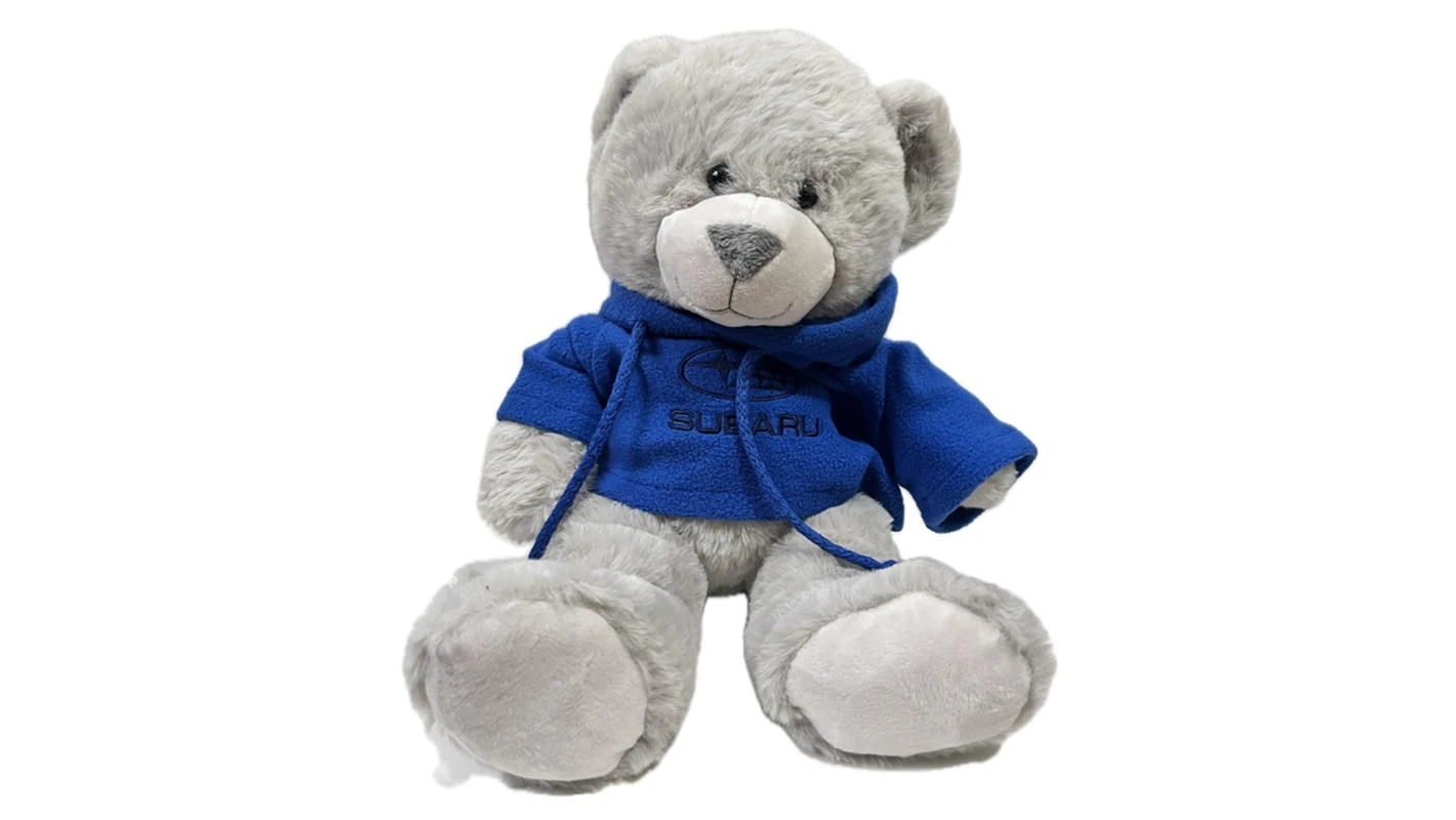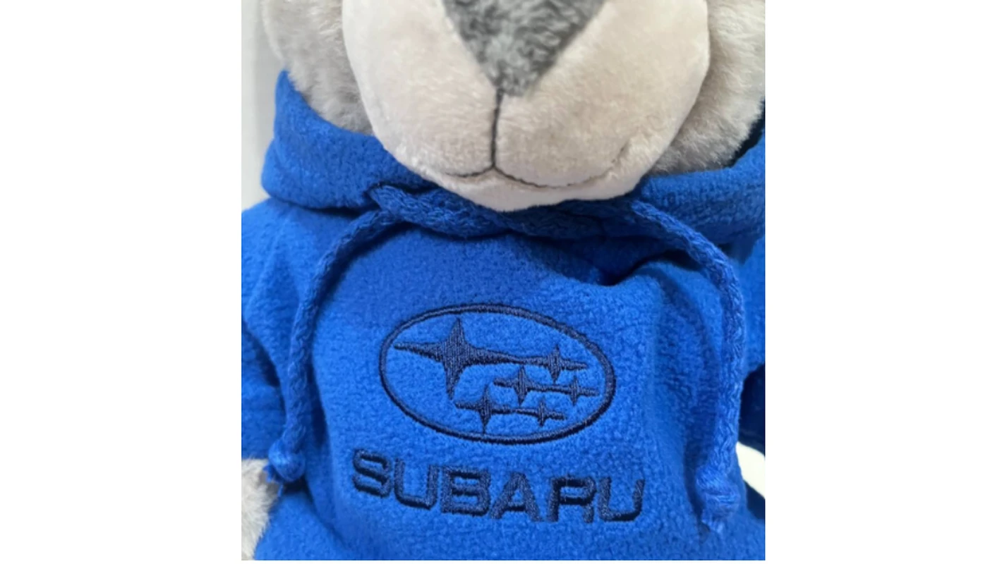 Одет в синюю флисовую толстовку с капюшоном, с вышитым логотипом Subaru.